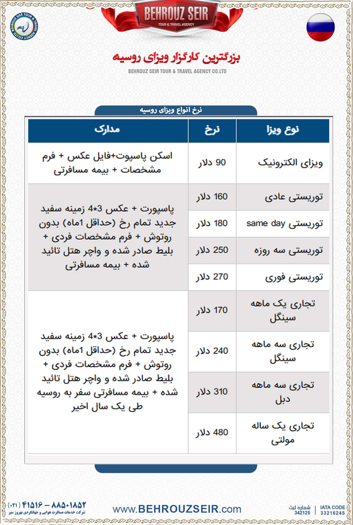 | تجاری یک ماهه سینگل | 170 دلار | پاسپورت + عکس 3*4 زمینه سفید جدید تمام رخ (حداقل 1ماه) بدون روتوش + فرم مشخصات فردی + بلیط صادر شده و واچر هتل تائید شده + بیمه مسافرتی سفر به روسیه طی یک سال اخیر |